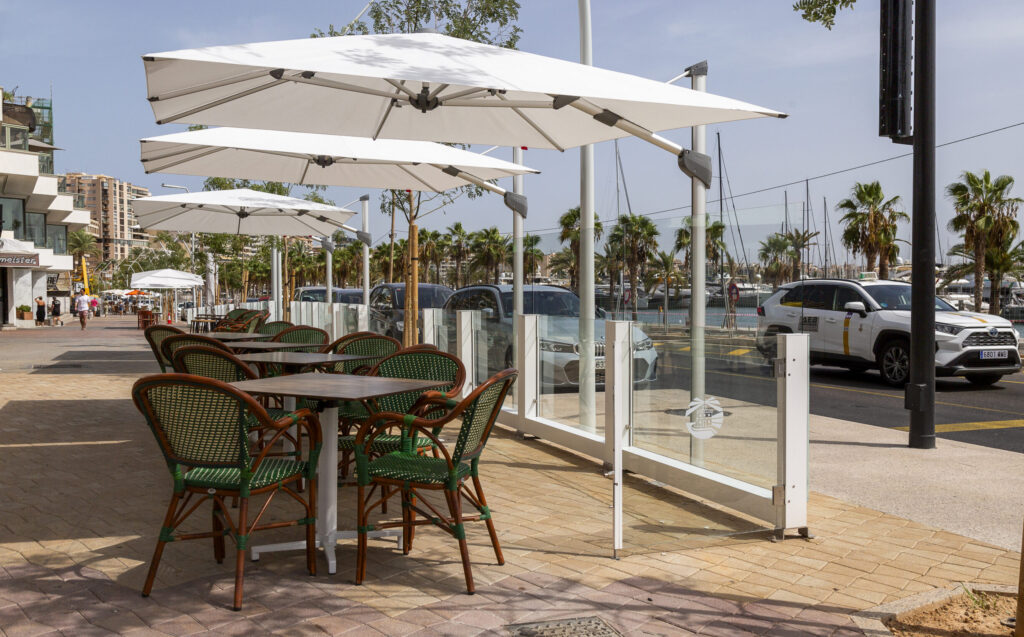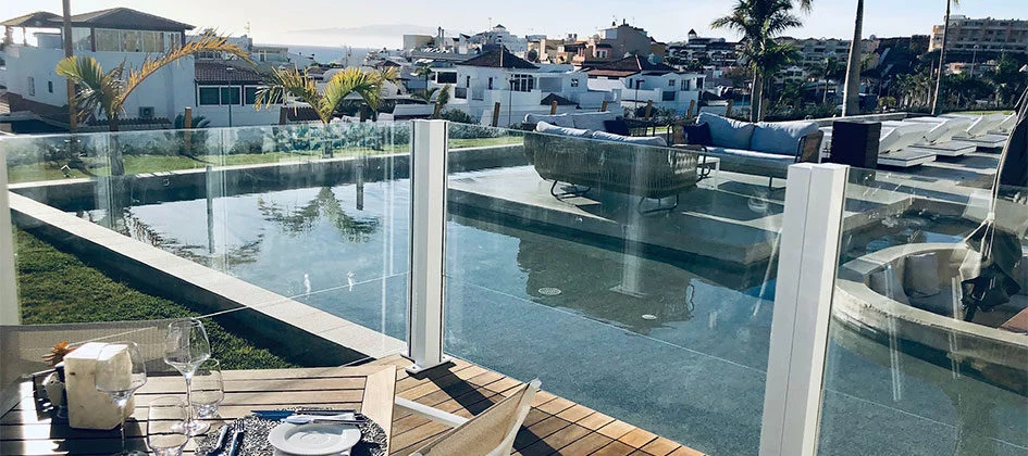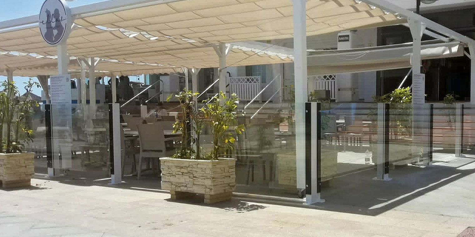 Els paravientos de cristal protegeixen terrasses i espais exteriors del vent sense bloquejar les vistes. Panells de vidre temperat amb sistema de fixació que permet diferents configuracions.
