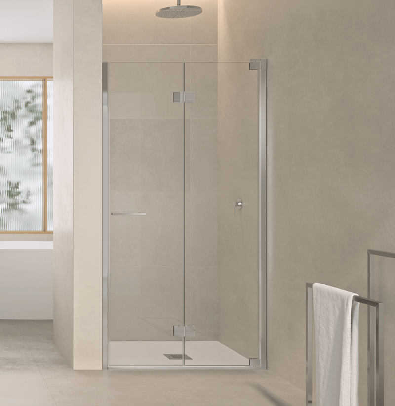 Doccia BORNEO shower screen. ORION collection. Front shower screen with one hinged panel, one fixed panel and one fixed side panel. 6mm glass. Height: 1950mm.