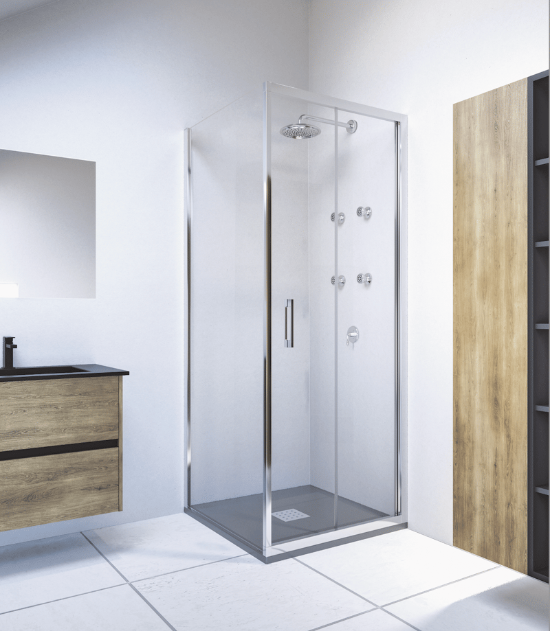 Mampara de ducha Doccia DOHA. Colección CENTAURUS. Mampara de ducha frontal de una hoja abatible, una fija y un lateral fijo Vidrio de 8mm. Altura: 1950mm. Antical.