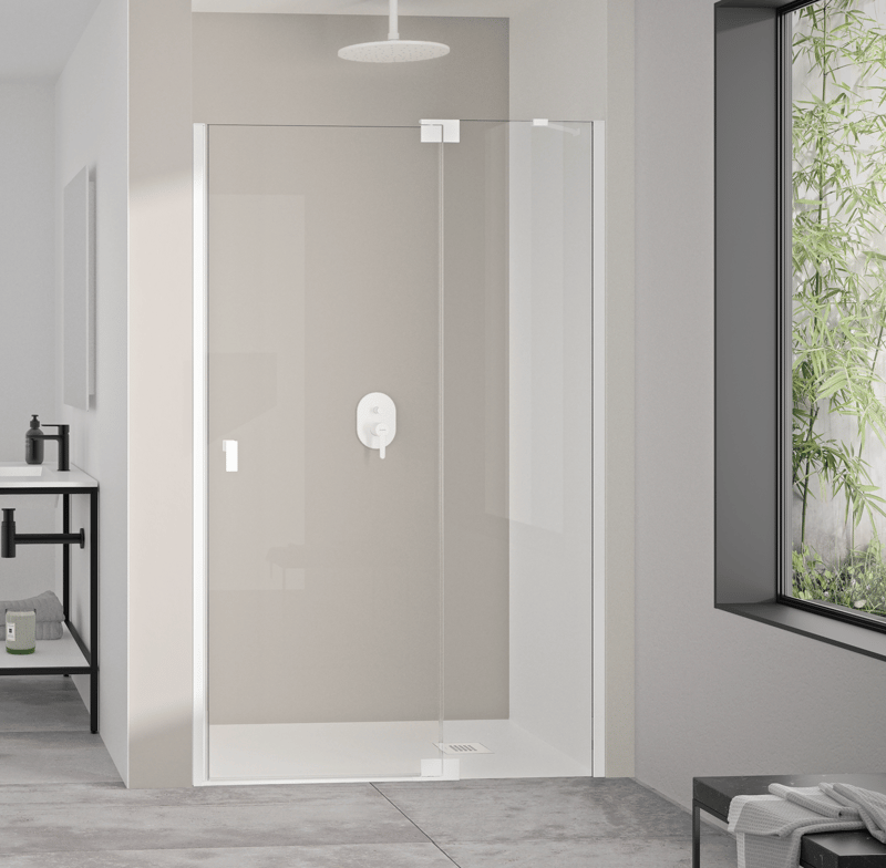 Hinged shower screen from the Doccia ST collection. 6 mm tempered glass, profile in Black, Silver, White. Height 1500 mm. Front opening from 700 to 920 mm. Installation included.