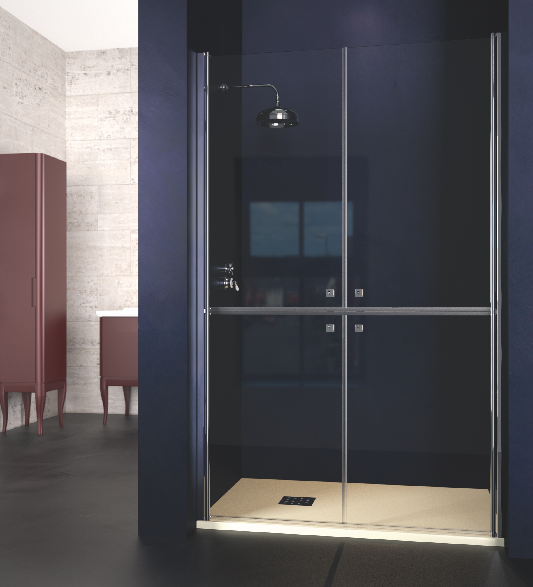 Doccia KRABI shower screen. PMR Collection. Front screen with two hinged panels divided into two parts. 6mm glass. Height: 1950mm.