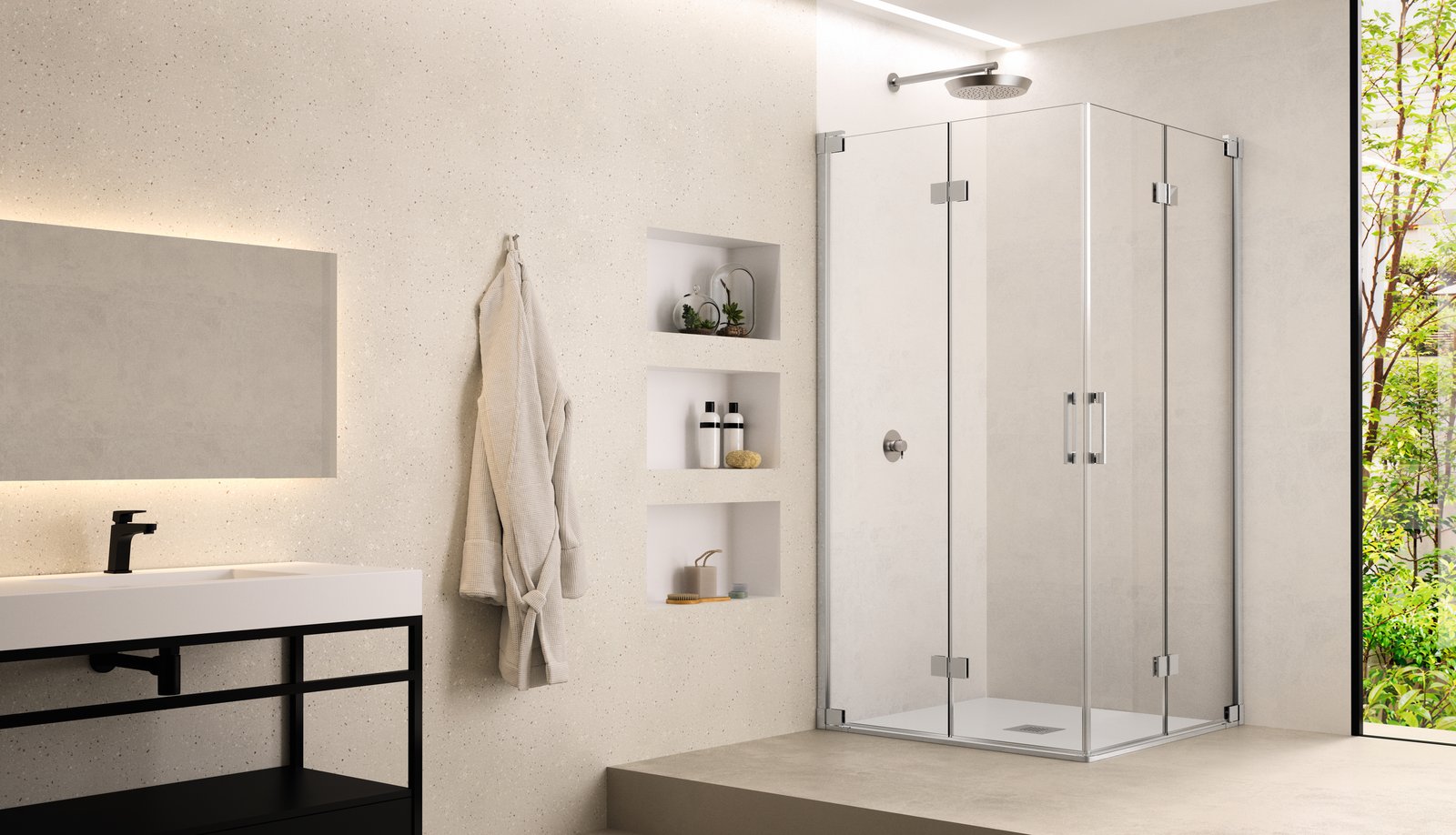 Mampara de ducha Doccia INCA. Colección CENTAURUS. Mampara angular de cuatro hojas plegables Vidrio de 8mm. Altura: 1950mm. Antical 2 caras, Reversible.