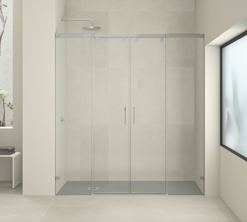 Mampara de ducha frontal de dos hojas correderas y dos hojas fijas