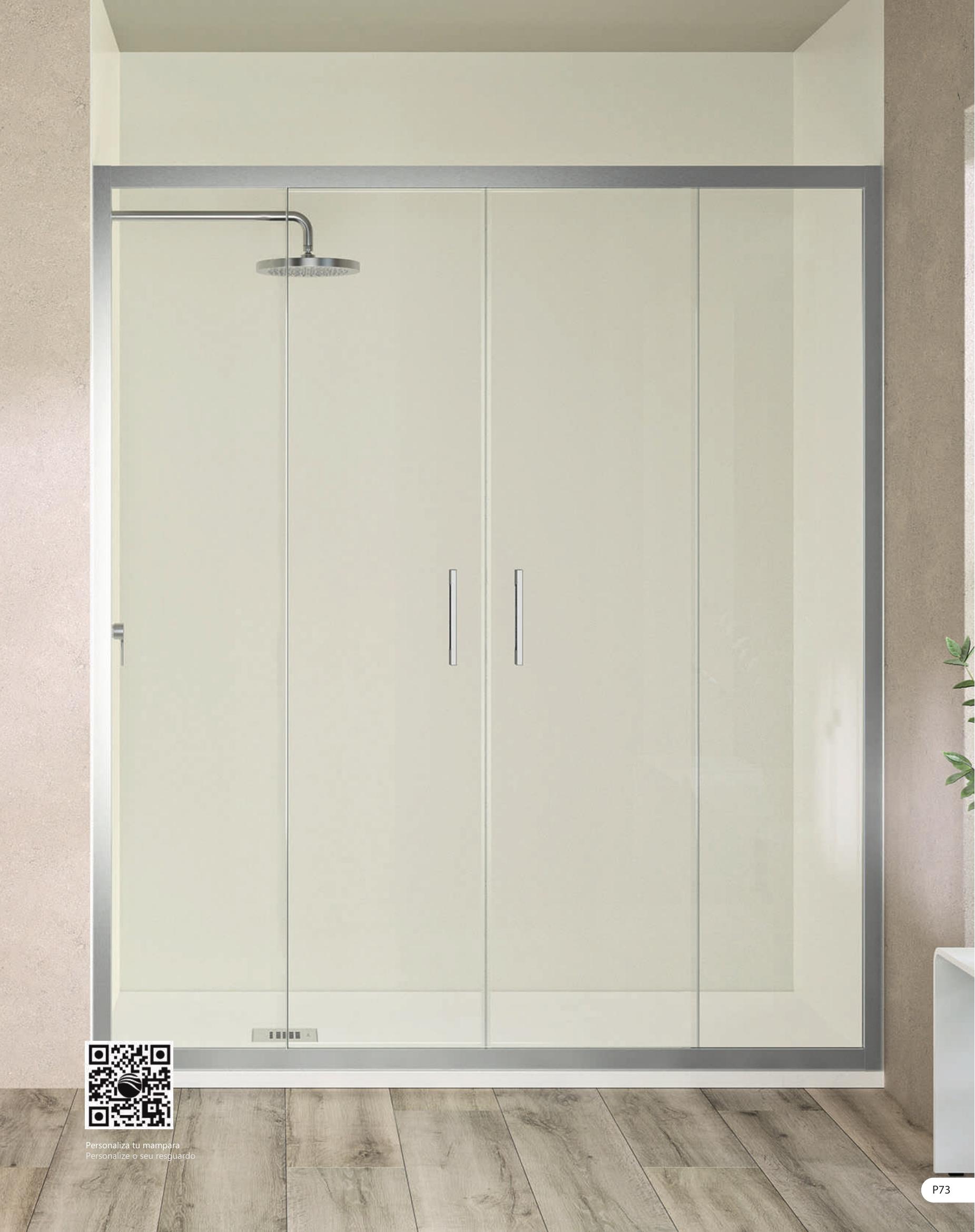 Disponible en los siguientes acabados de perfil: Negro, Plata. Altura estándar de 1980 mm. Apertura frontal de 1450 a 2000 mm.