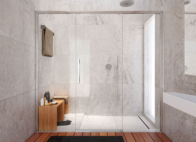 Mampara para bañera y ducha con hojas correderas. Vidrio de seguridad de 6 mm. Perfiles verticales reducidos con compensación de 10 mm. Hojas correderas sin guía inferior. Sistema anti-vuelco de hojas. Rodamientos compensables en altura 4 mm. Equipada con cierre…