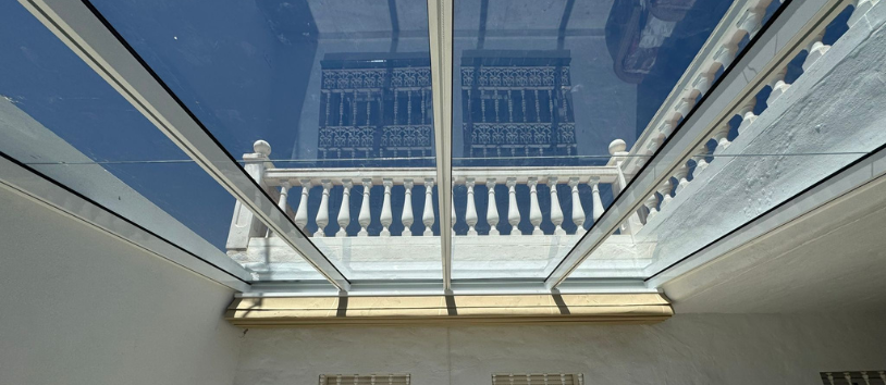 Techos fijos de cristal Serie Atlas. Máxima luminosidad y protección permanente. Vidrio templado laminado. Compatible con cortinas de cristal y otros accesorios.