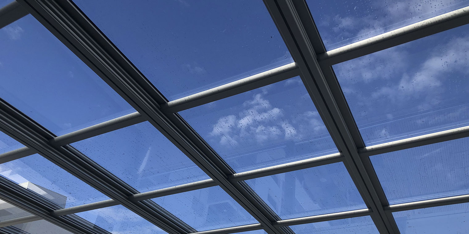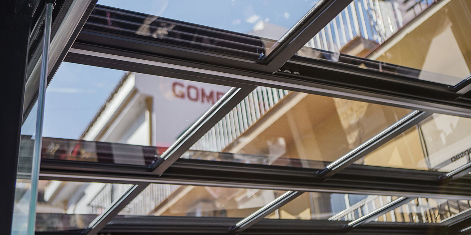 Techos móviles de cristal con apertura motorizada. Paneles de vidrio templado deslizantes. Sensor de lluvia opcional. Máxima luminosidad todo el año.